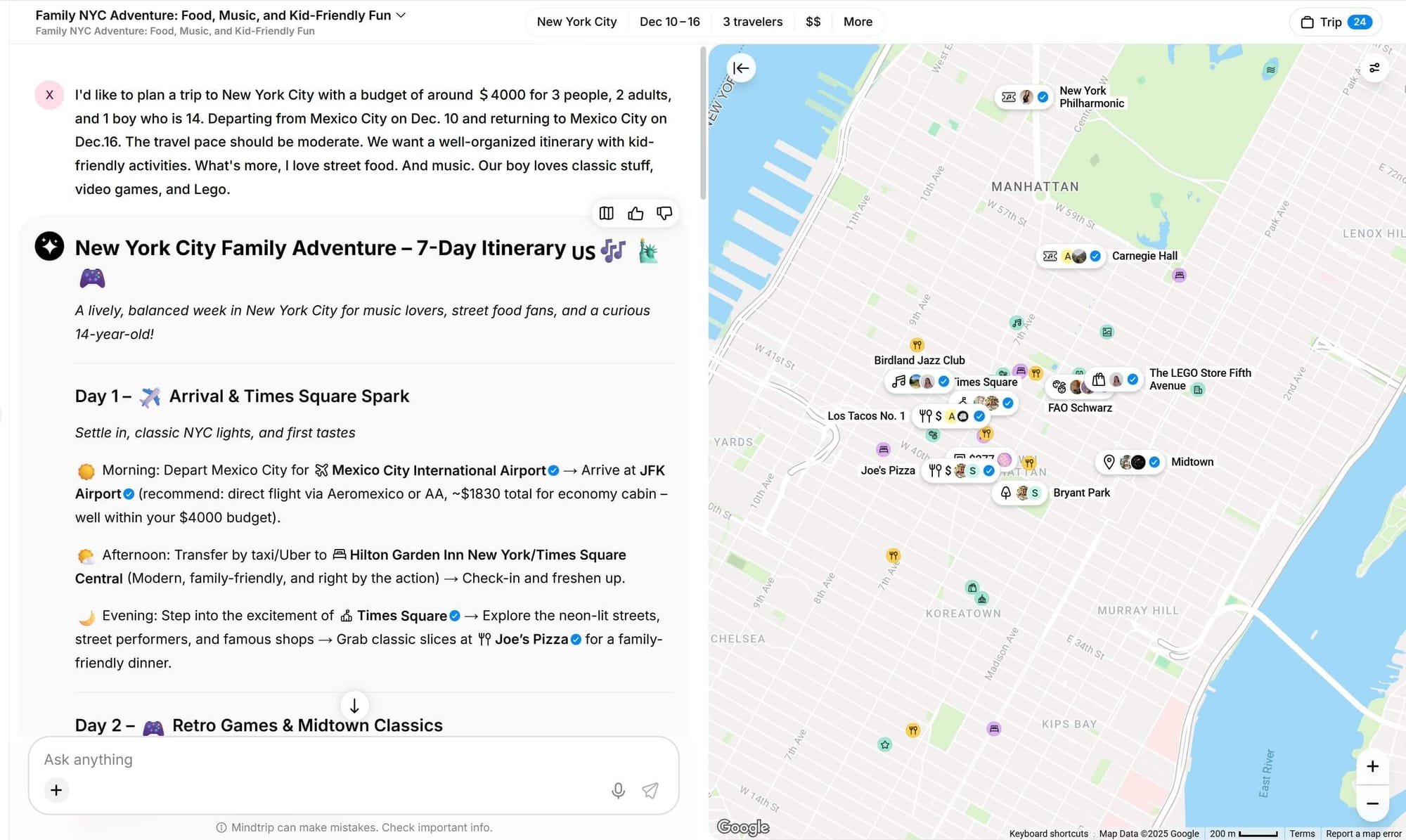 - Mindtrip: features inspiration, discovery, and collaborative planning. You can start planning not only with text but also with pictures or URLs. The function of collaborative planning is convenient for brainstorming with your co-planner. But for complex itineraries, it's not powerful enough. The ability to provide available flights and trains still needs improvement. For visual experience, stops are not clearly labeled in a clear order, and users cann't quickly understand the actual flow of the trip at a glance.
