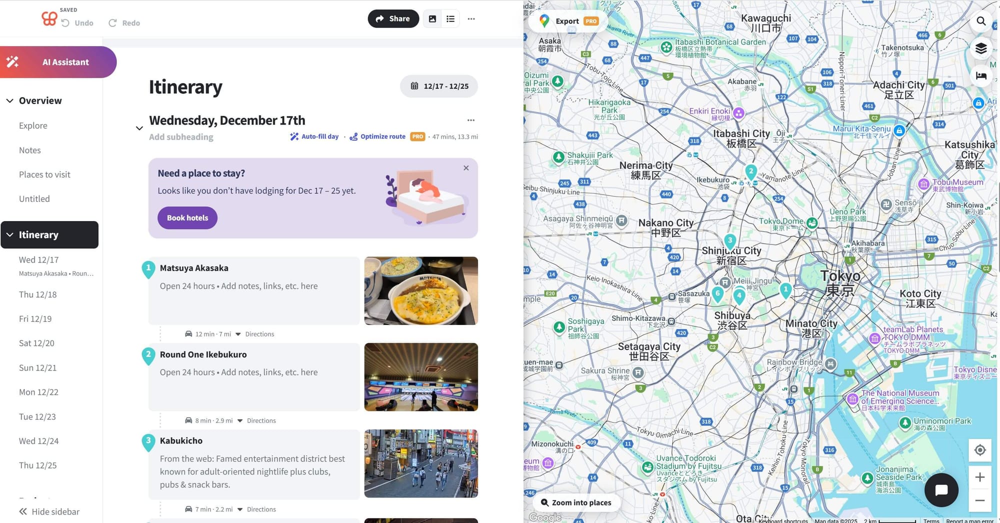 TripIt is known for organizing all your bookings, like flights, hotels, and car rentals, into one itinerary automatically. You just need to forward confirmation emails. It works well for travellers who need a clear timeline of their reservations. But for more functions like real-time flight alerts, seat tracking, and fare monitoring, they offer a paid subscription.TripIt alternatives are needed for travelers looking for free travel planning tools and more functions, like a visual itinerary on a map, adjustable schedules through dragging and dropping, collaborative planning in real-time, and AI-driven trip planning.