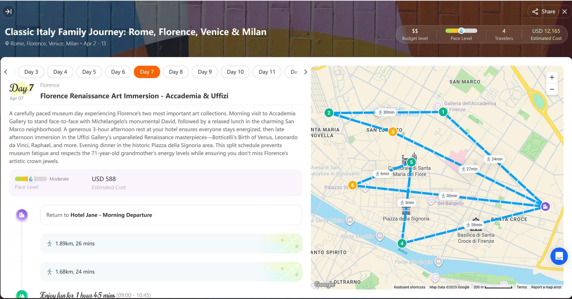 - iMean AI: well-designed as a visual itinerary planner and AI trip planner. The map marks the order of each stop and also shows the recommended transportation between them. When you check the itinerary, it automatically follows the trip’s progression. With the ability to handle multi-city trips, complex needs, and instant adjustment, it can generate the smoothest itineraries automatically. It's free to use, and you can share the itinerary with others without extra fees. Although generating an itinerary requires more time, it's worth it.
