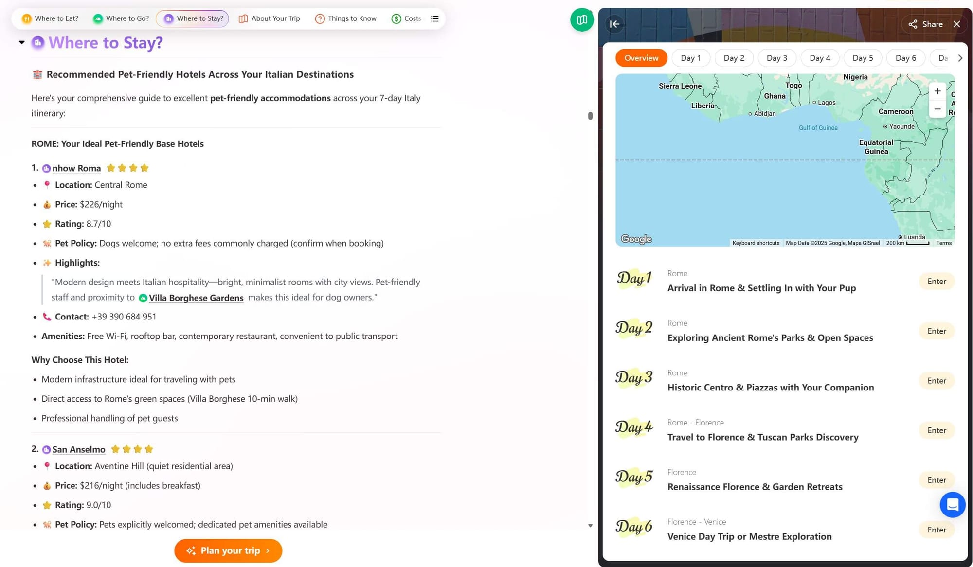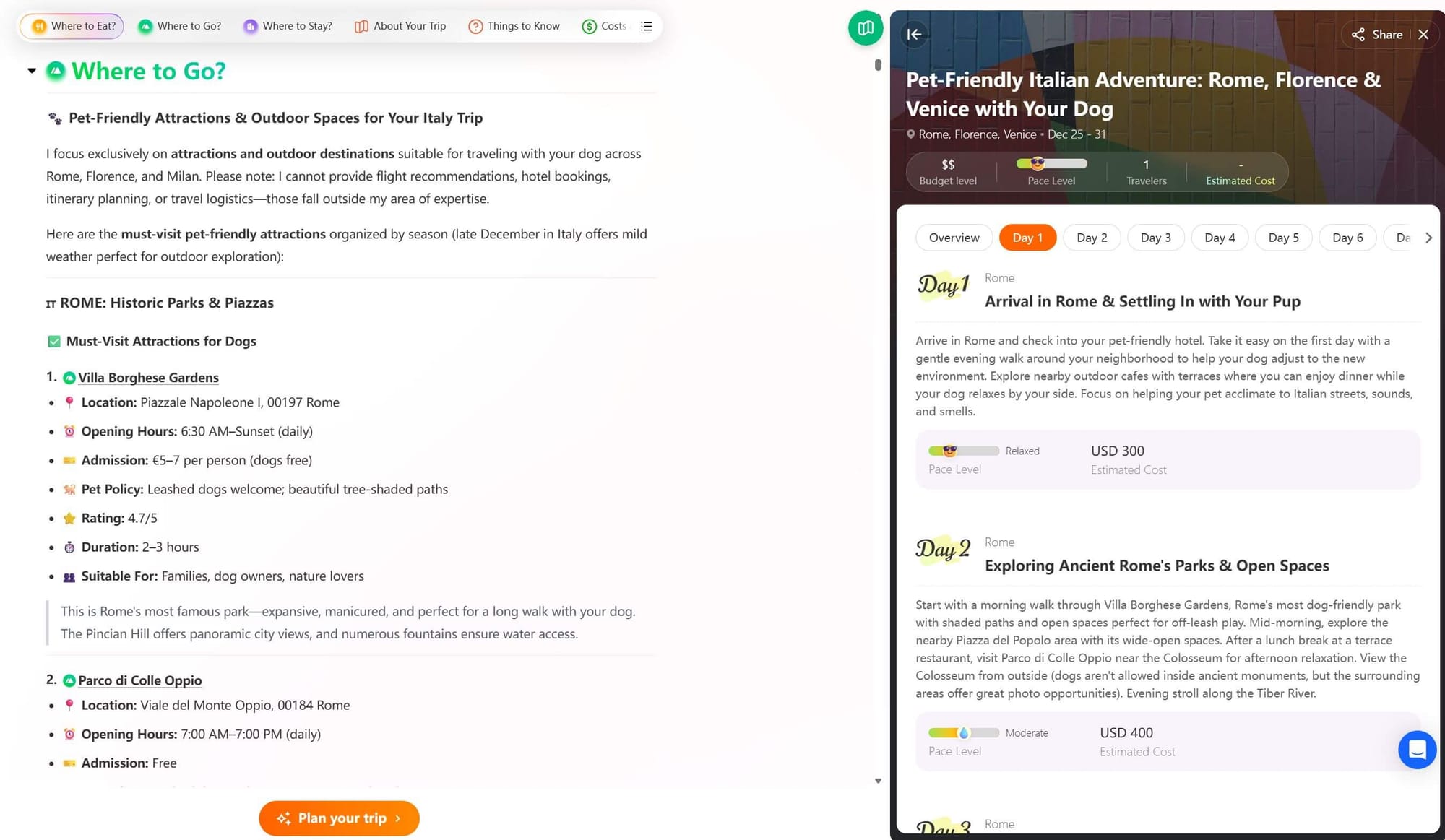 - Step4: Check the details and make adjustments. Focus on the stay of every destination and judge if the travel pace is reasonable. For hotels and attractions, call and ask about their pet policy.