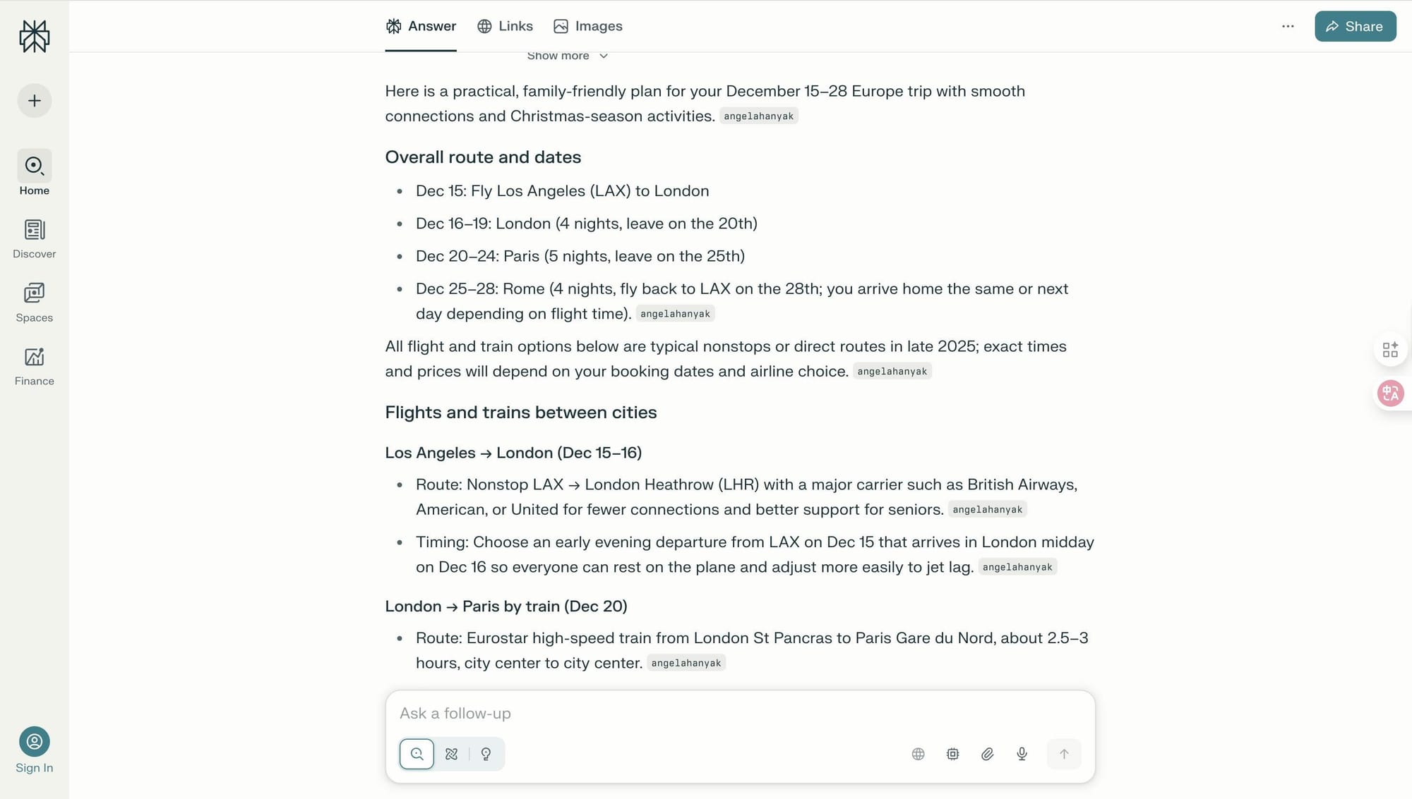 Perplexity responded to my prompt with a simple, "Ok, here is the structure of the answer along with sources." It was quite well-organised. It provided a broad overview of my route, flight options, and hotels and also presented general suggestions for senior citizens and children. Perplexity used bullet points for all of its answers with references to various travel blogs, airline websites, and family travel articles under each bullet point. The response does not appear to be a conversation; it appears to be this mini-report. If ChatGPT is my friend who breaks it all down for me, then Perplexity is a friend who gave me three links and says, “Here, I checked, you’re okay.”