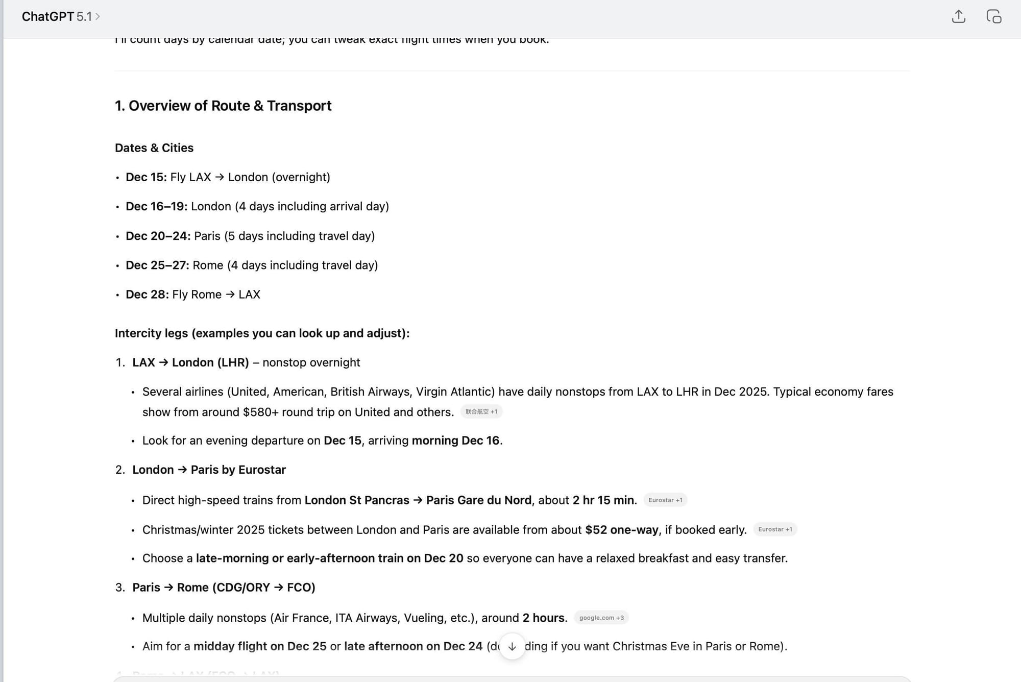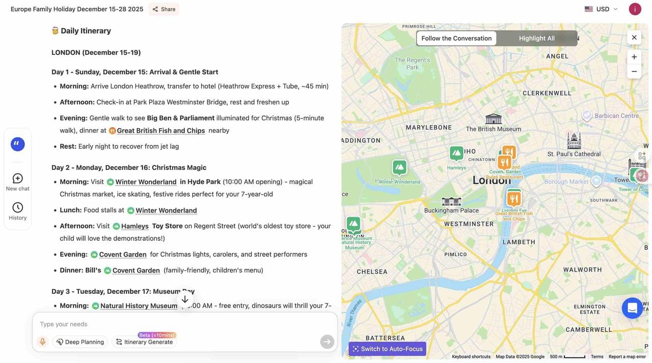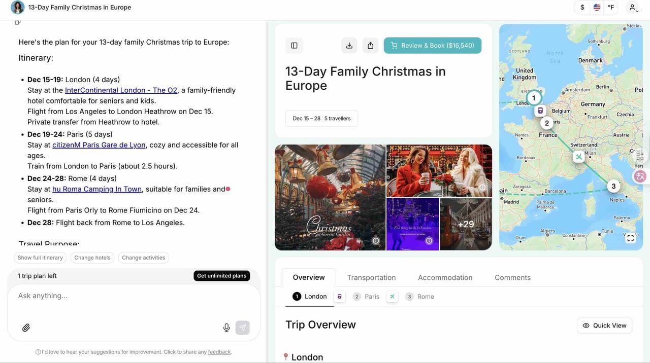 My family is planning to have a "Christmas the European way” this winter. It sounds fabulous until you have to face the details: 5 people (2 adults, 2 seniors, and a 7-year-old), 3 cities, a lot of Christmas stuff, and the significant distance from Los Angeles. That's what made it an experiment for me. I put together one extensive prompt: