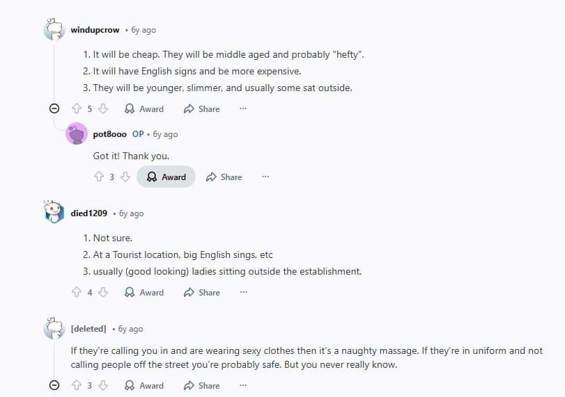 About 18% of the Reddit threads mentioned tourists who accidentally walked into unexpected service venues or didn’t understand the risks involved. Some thought they were regular massage shops. Others underestimated safety concerns in these environments.