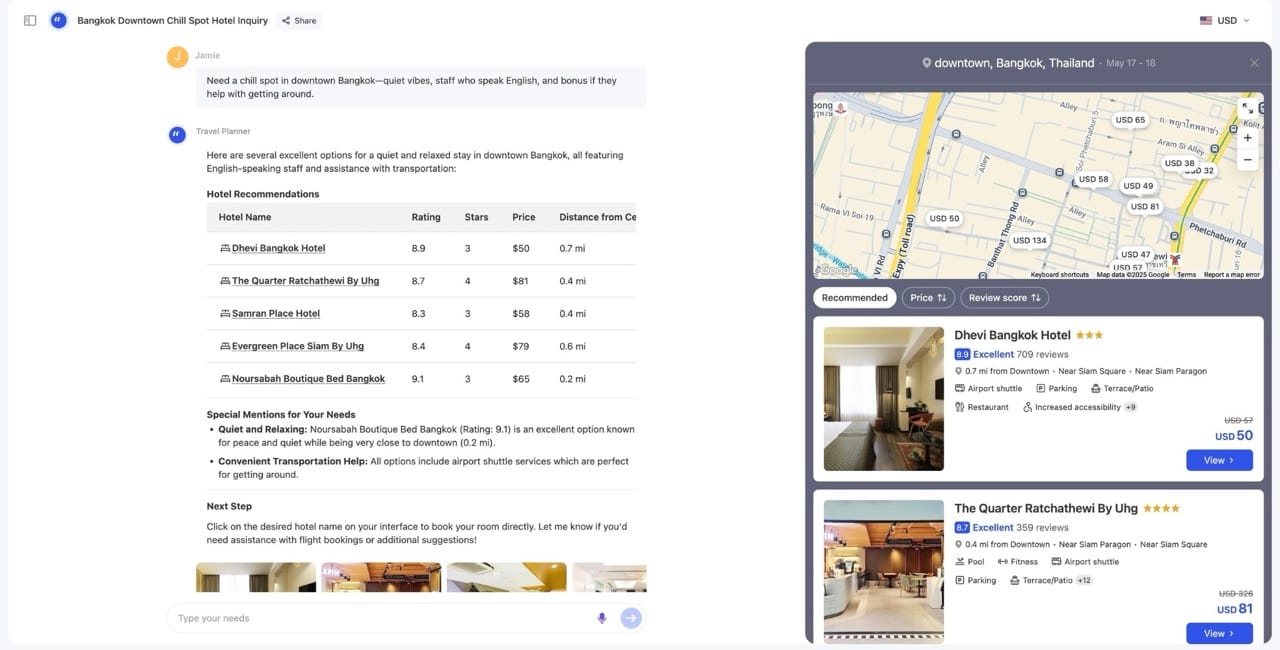 That’s when a friend recommended she use iMean, a browser-based AI travel planner that builds itineraries and makes hotel suggestions based not just on cost or proximity but on tone and experience. Instead of plugging in dates and hoping for the best, Jamie started a dialogue: She explained she wanted a quiet, central place with staff who could speak English, ideally with airport transfer or help navigating local transit.