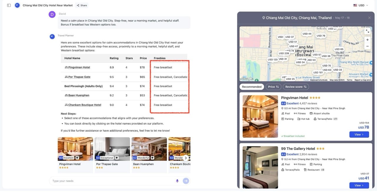 Take David and Meera, a retired couple from Australia planning their first trip to Southeast Asia. They used iMean to search for accommodations in Chiang Mai. Their priorities: a quiet guesthouse with step-free access, walking distance to a morning market, and staff who could recommend day trips. Within minutes, the platform suggested three options in the Old City, each with photos, relevant guest reviews, and clear location info. It even highlighted which hotels offered breakfast with Thai and Western options—a comfort Meera didn’t think to ask for, but was grateful to have.