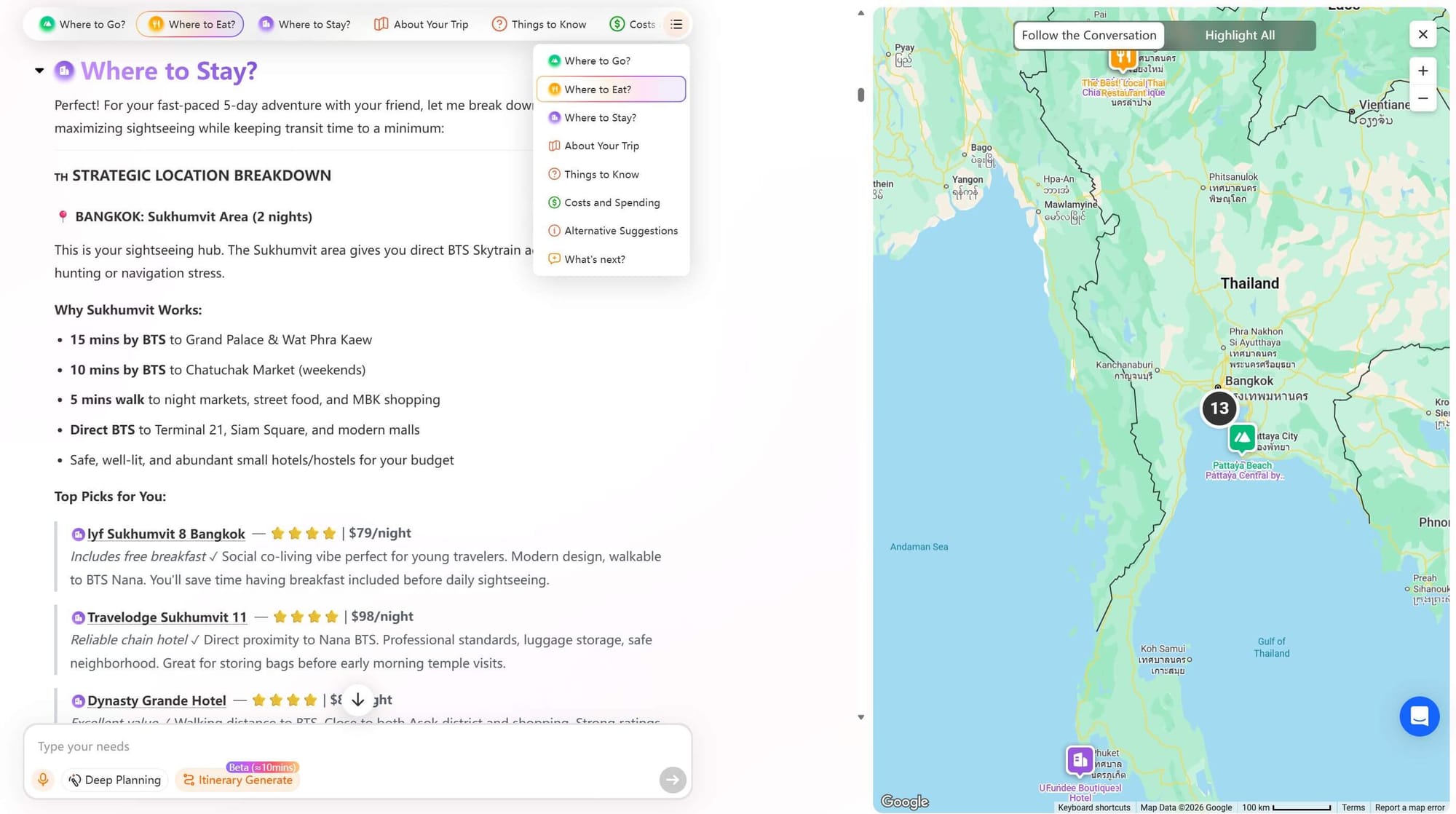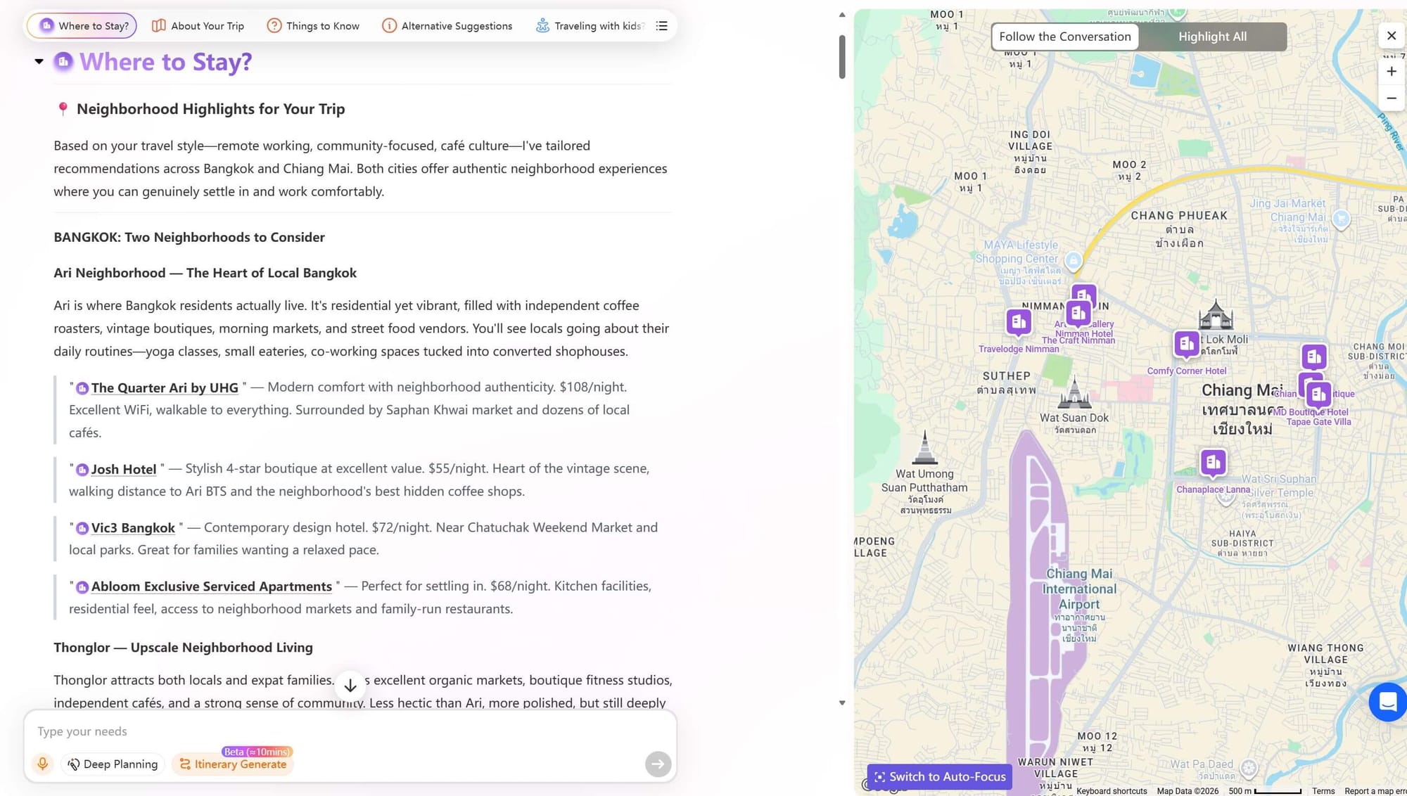 Case 2: For a digital nomad who wants to have a two-week trip in Thailand, the AI recommends areas with a strong local vibe, plenty of cafés, and a lifestyle that allows him to experience daily life like a local.
