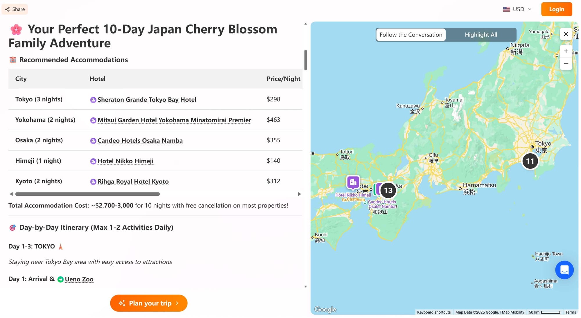 After chatting, iMean AI analyzed their needs and helped them solve their worries. It mapped out attractions with animals and interactive museums for their boys and recommended the best spots for viewing cherry blossoms. For the transportation, which seems the biggest worry for them, iMean AI planned every transfer, and arranged the timetable for trains properly.