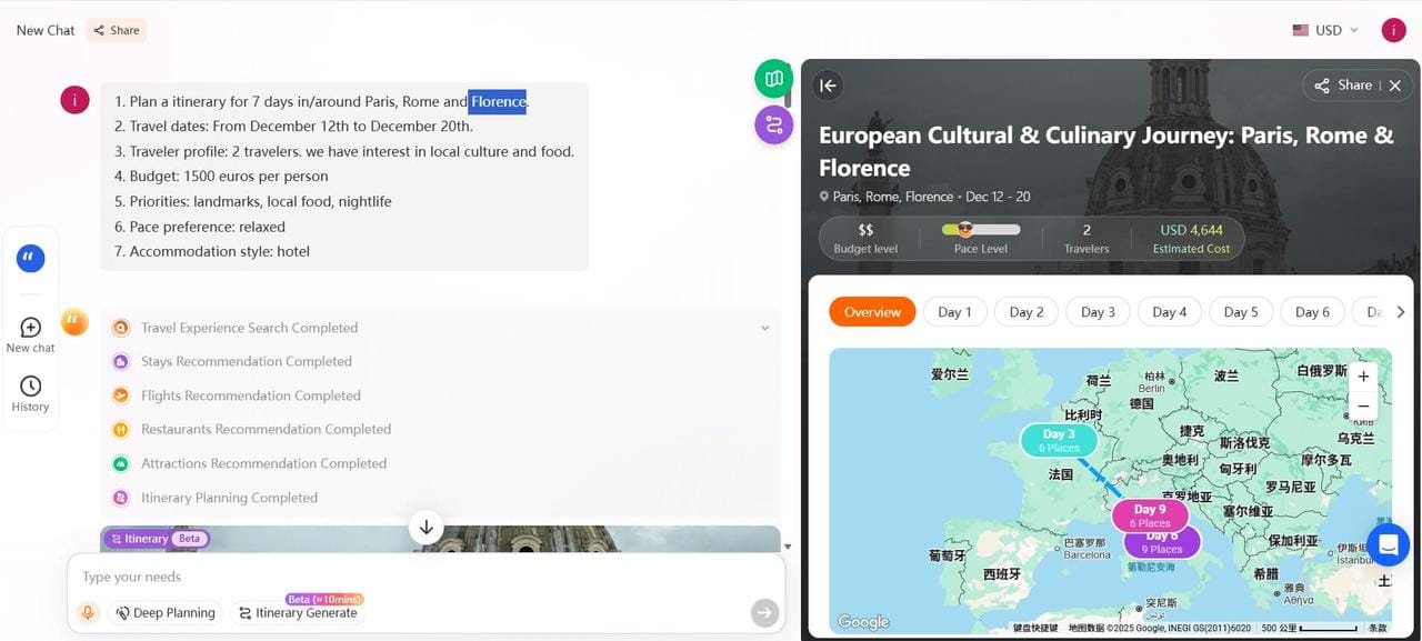I'd like to show my itinerary for Paris, Rome, and Florence. Actually, I had dreamed about traveling around these places for years. But as we know, multi-destination itineraries are hard to plan perfectly, so I’ve been lacking motivation to push the whole journey ahead. Fortunately, everything works out with the help of my destination planner. After I told iMean AI my interests, it quickly responded.