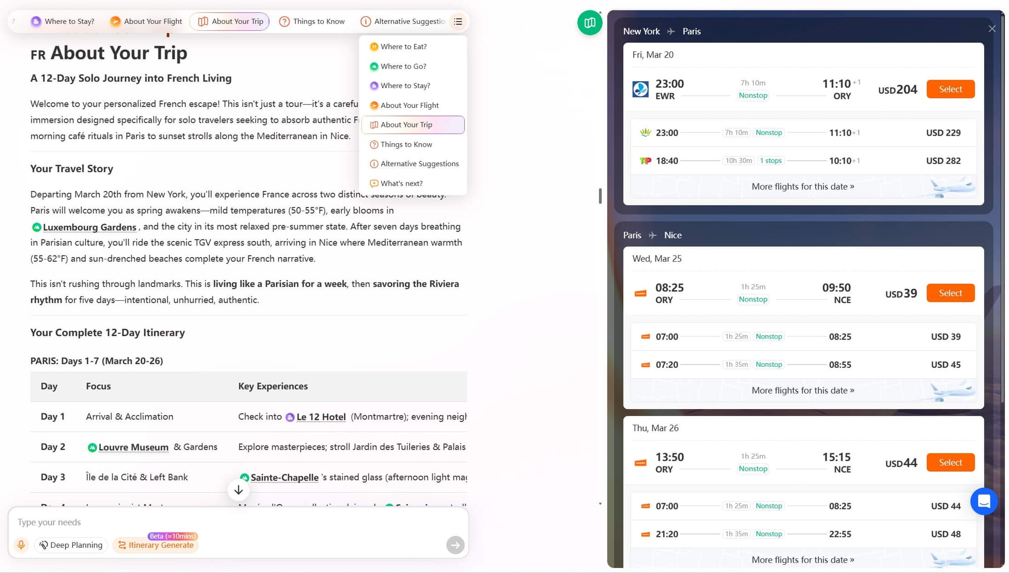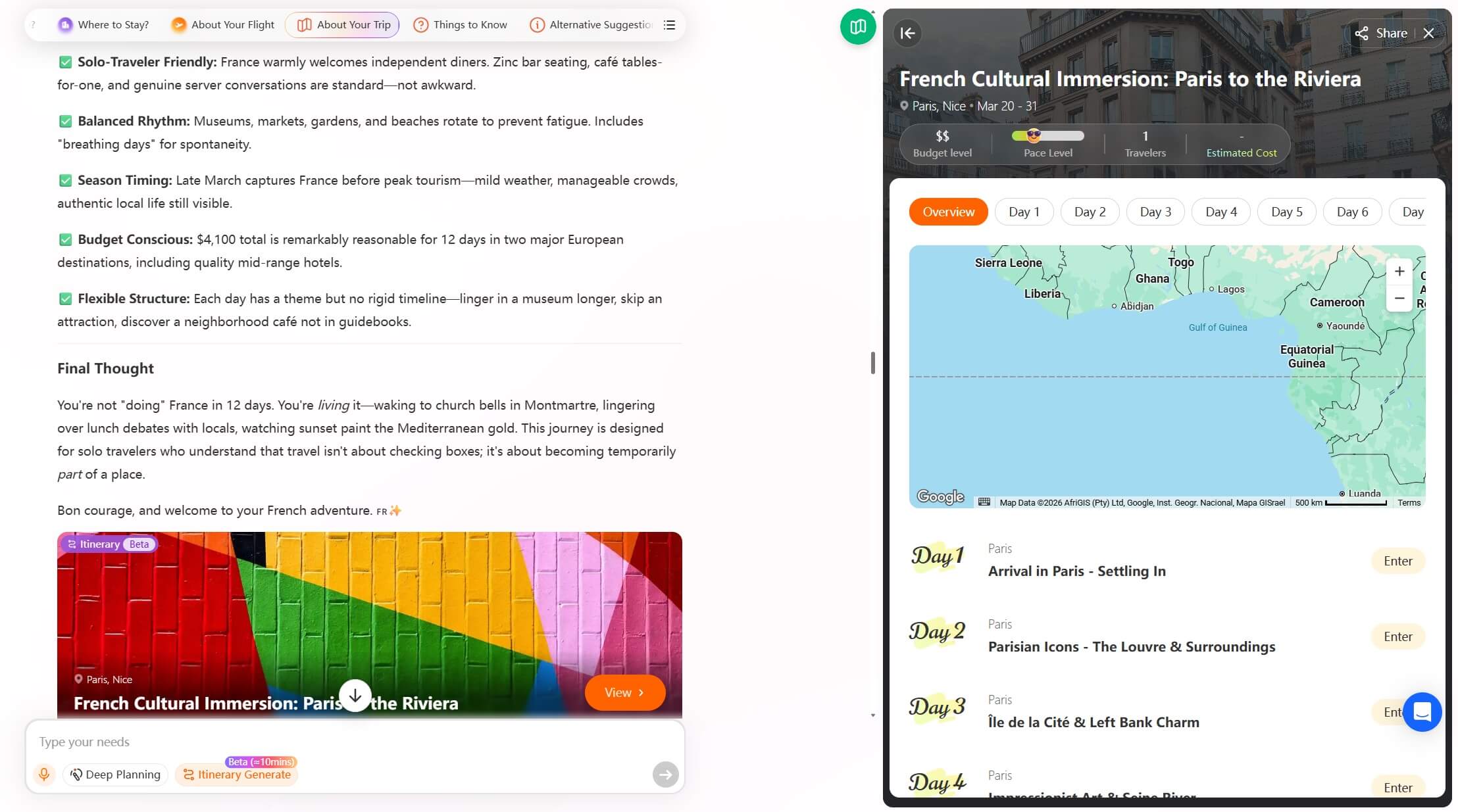 Once I see the plan, I start making small edits because I want to try more French food and spend more time on the beach. The AI updates the itinerary immediately, adjusting routes, timing, or hotel choices based on what I say. Here I got the final version of my itinerary.