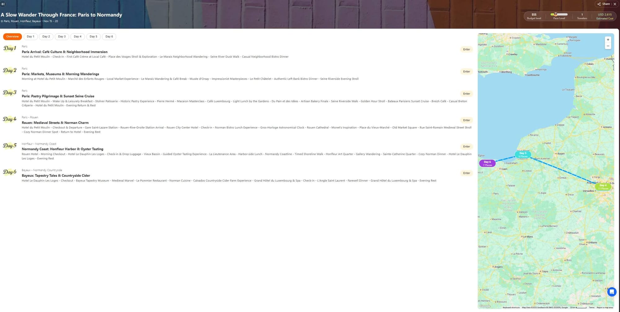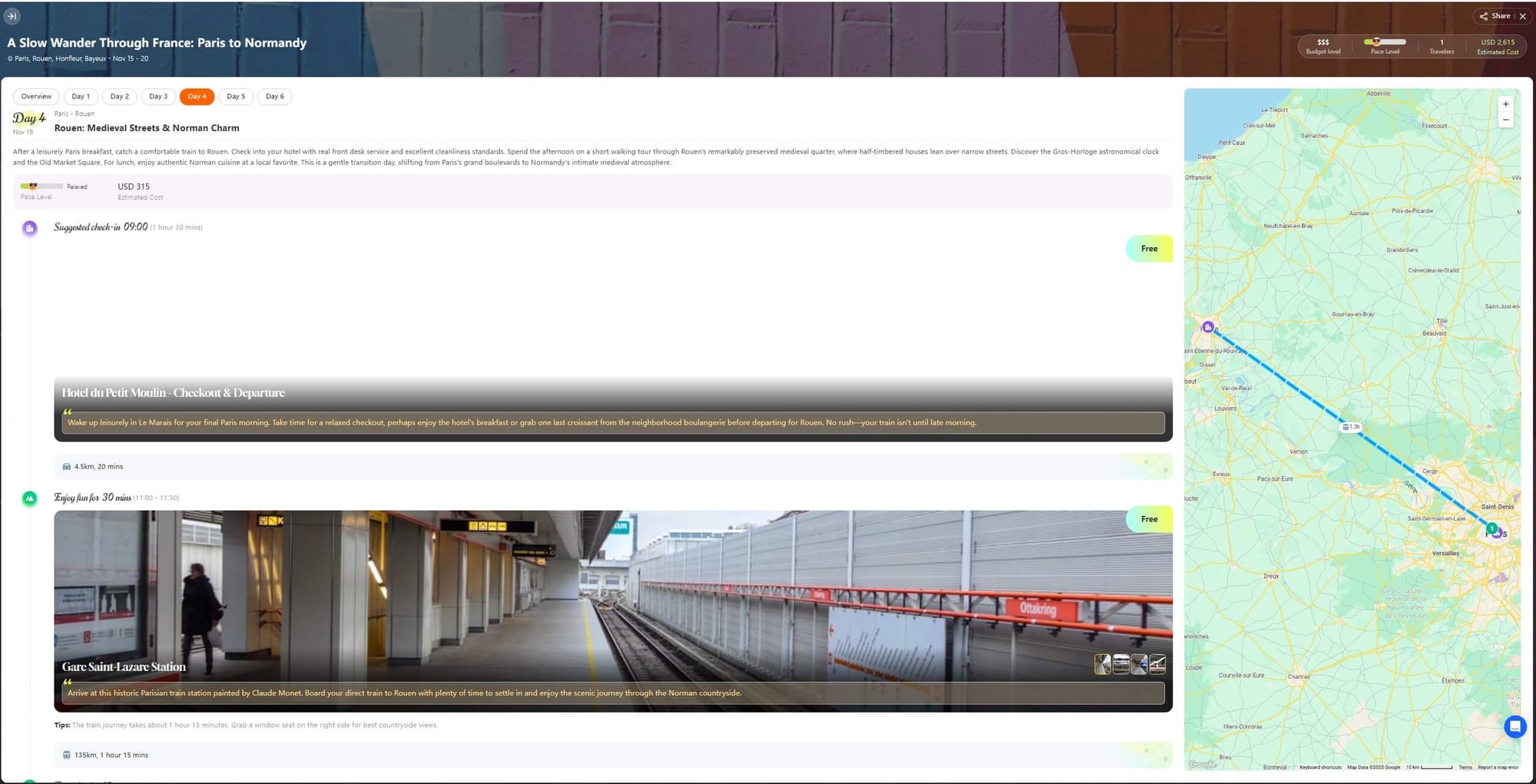 iMean AI suggested four slow days in Paris, followed by a rail-and-coast loop through Normandy. It picked a small hotel on a bakery street and booked a mid-afternoon museum slot for our second day. The AI recommended an evening Seine cruise for the third night and left full mornings open for wandering.