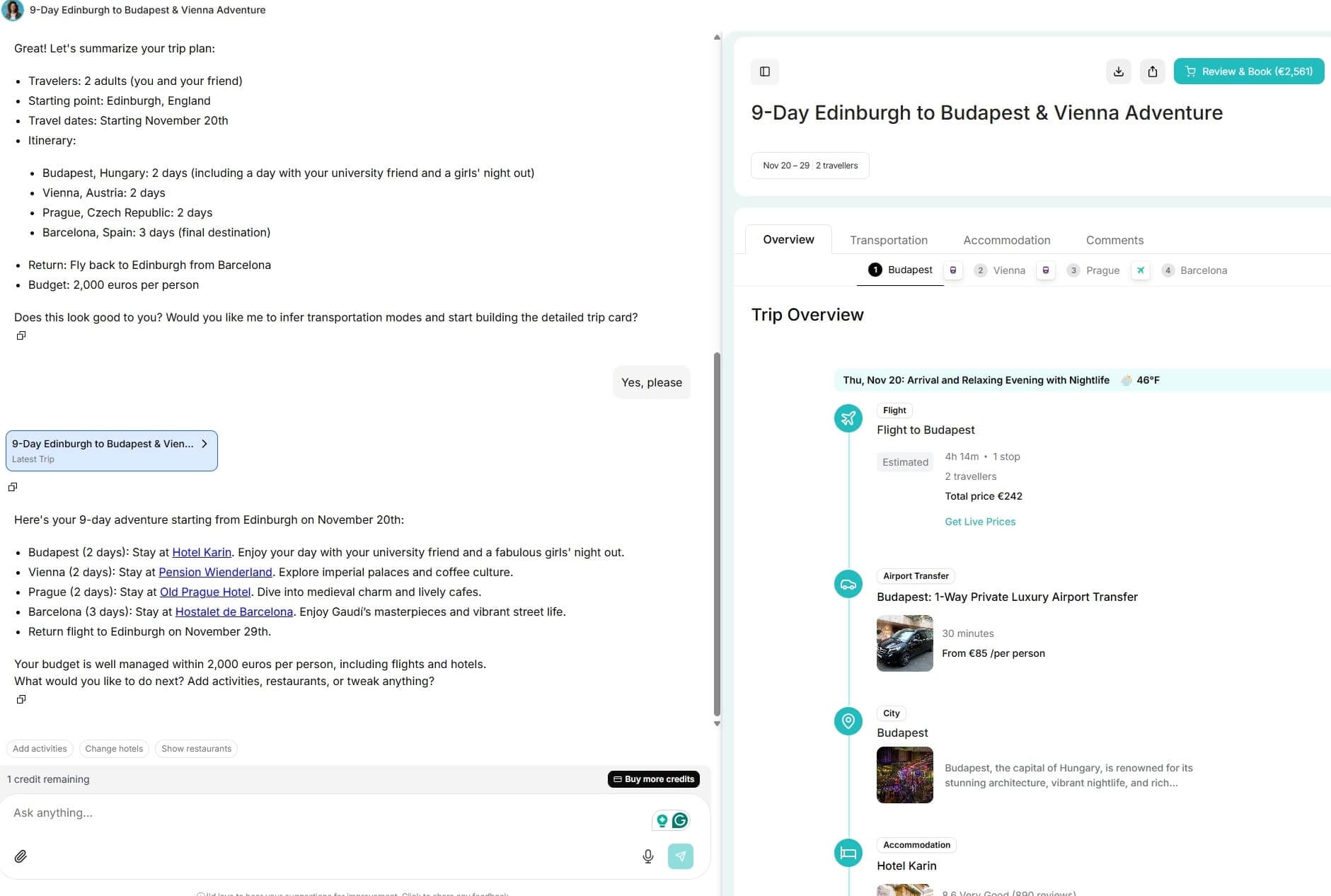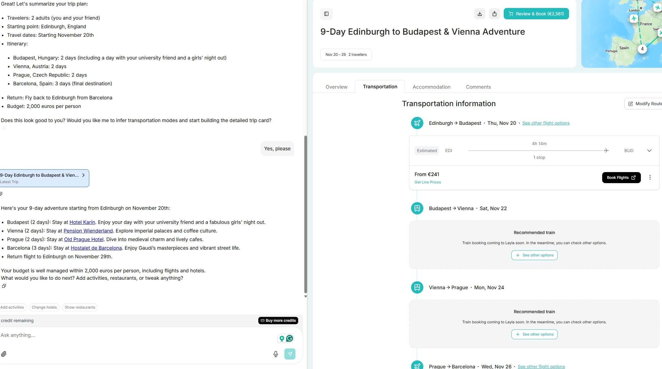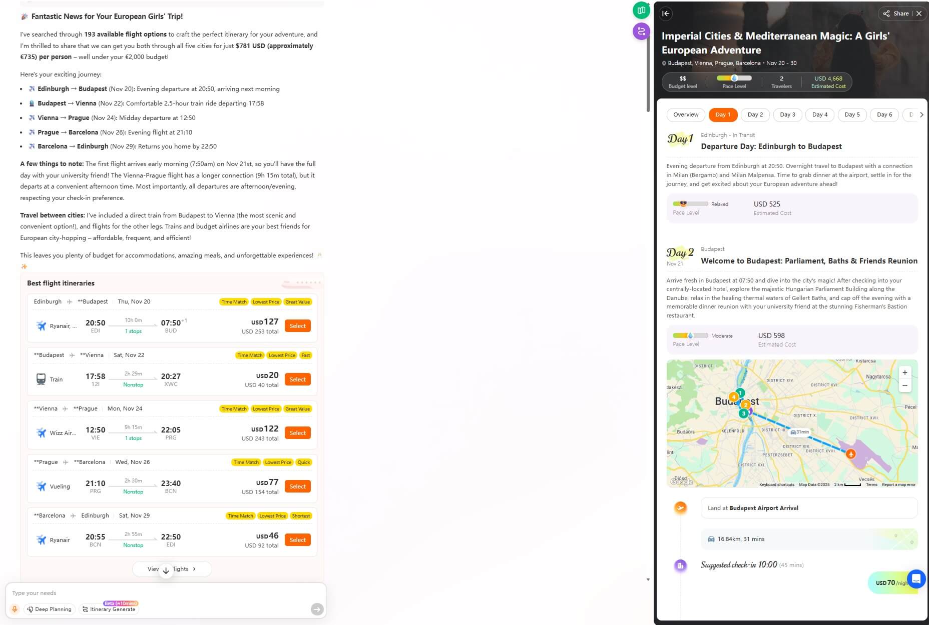 - It mixed flights and trains in a logical way without inventing fake transit routes. Meanwhile, it gave me the cheapest suitable options with reasons and links to book.