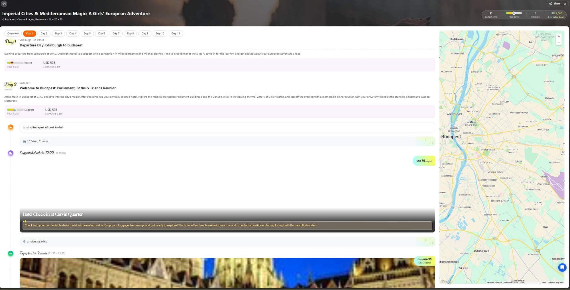 - The whole trip looks very detailed, and each recommended place is accompanied by ratings, budgets, and locations.