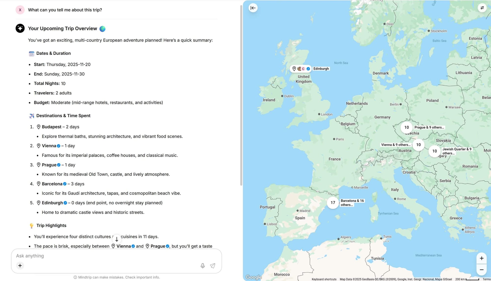 Mindtrip stands out with its sleek interface. The UI makes trip ideas look inspiring. But when I asked for a full multi-country itinerary, things started to fall apart.