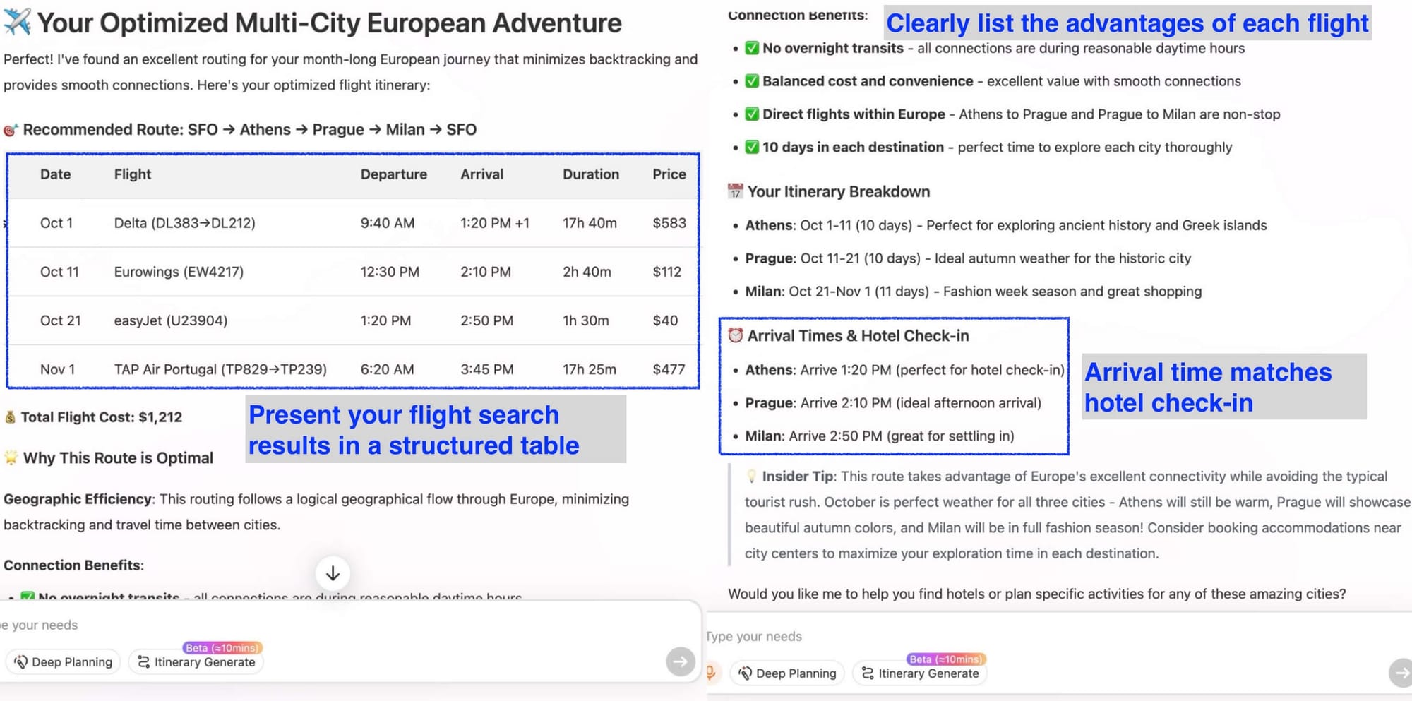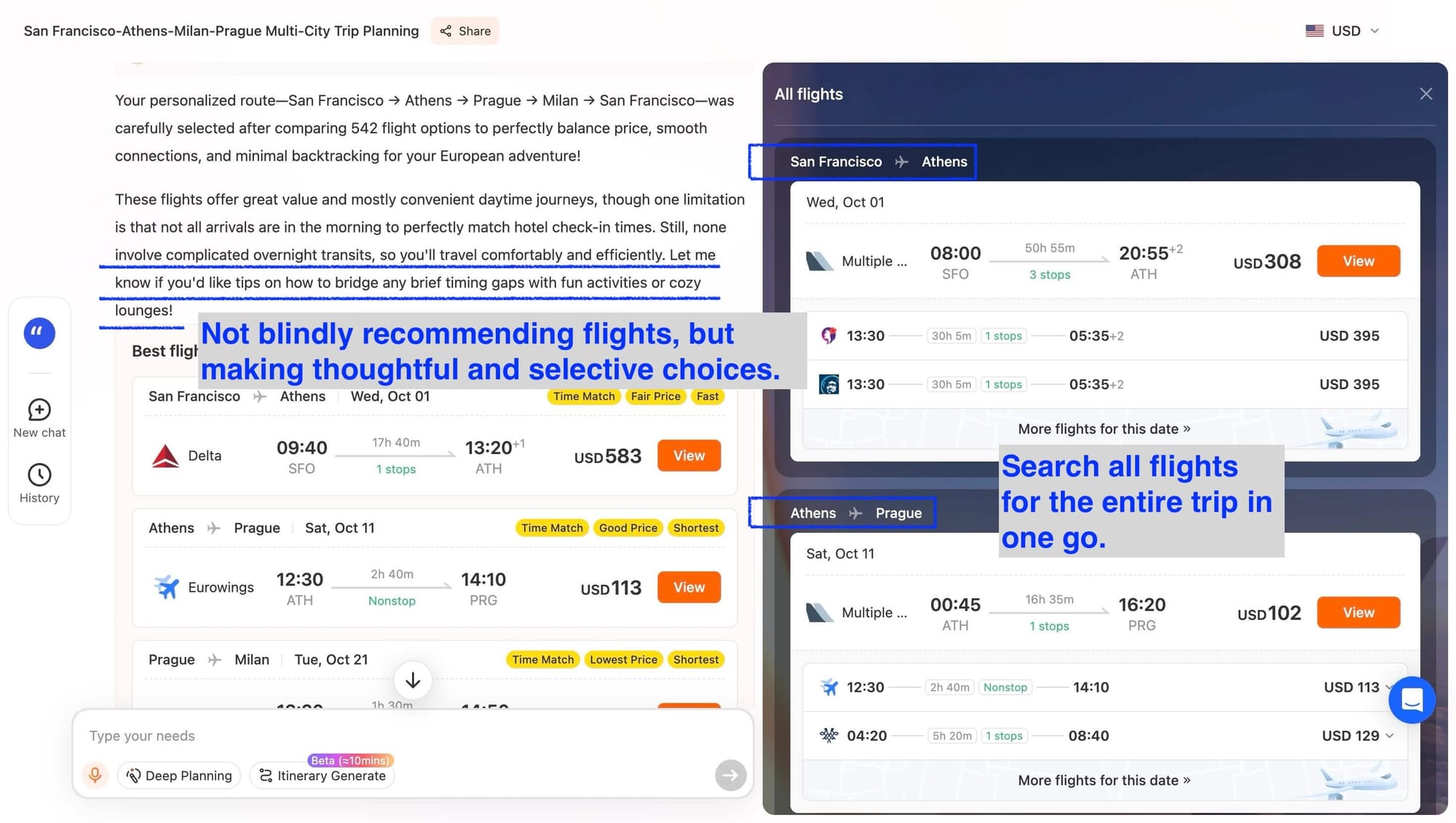 For a user planning a multi-city journey from San Francisco to Athens, Milan, and Prague, iMean AI structured a route that optimized connection times while minimizing backtracking. Each flight came with reasoning like: