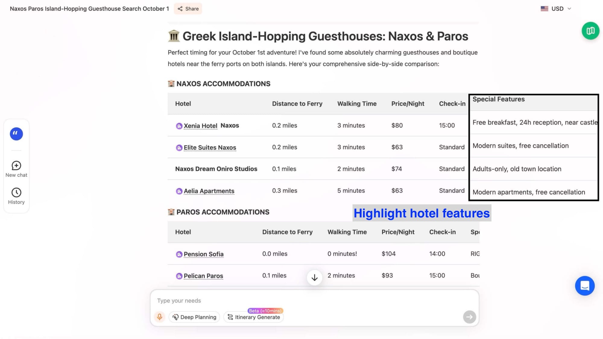 In a Greek island-hopping scenario, a user seeking “charming guesthouses under $120 on Naxos and Paros, near ferry ports” received a side-by-side comparison of stays—including walking distances to ferries, check-in windows, and nearby cafés.