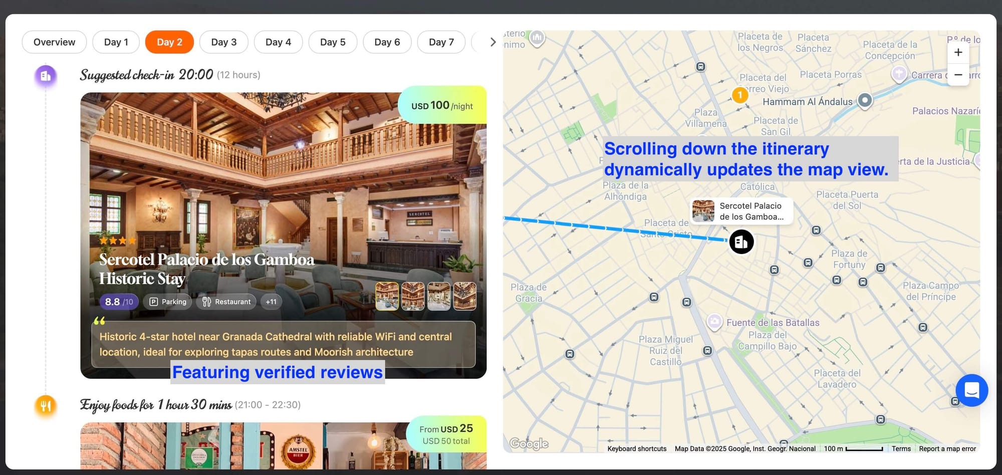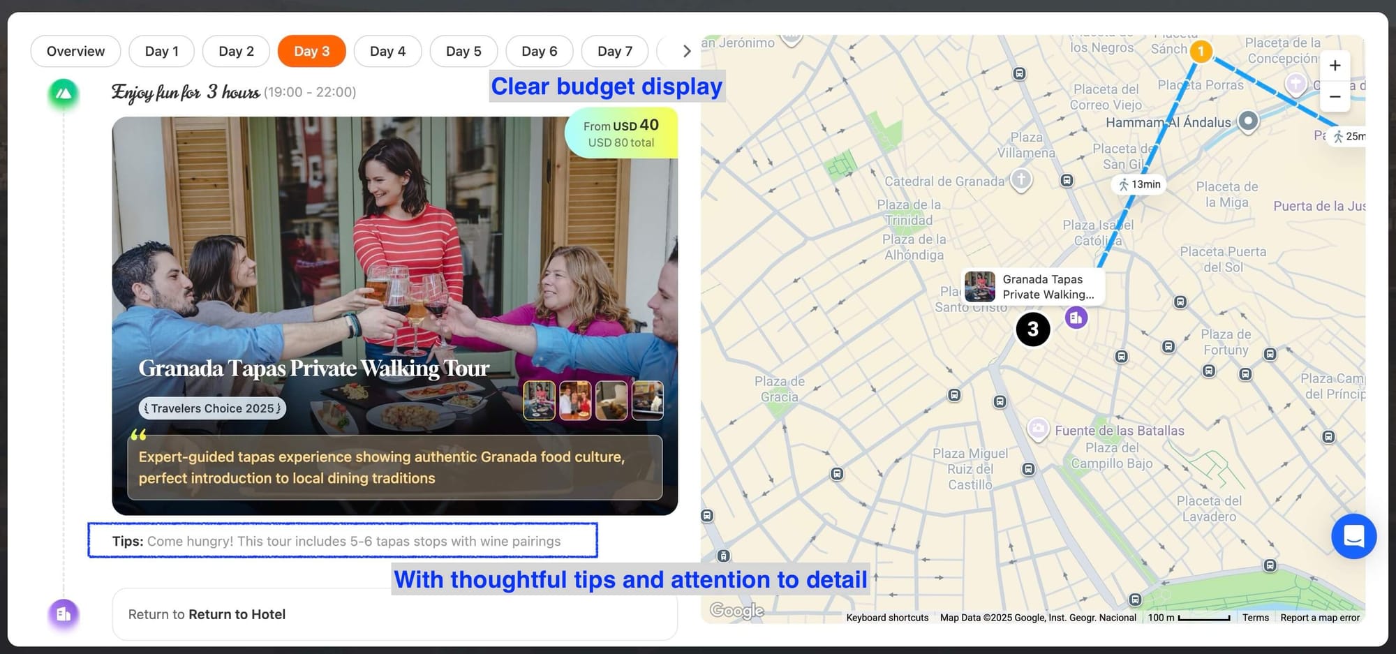 - Day 1–3 in Granada (midday coworking + tapas map),