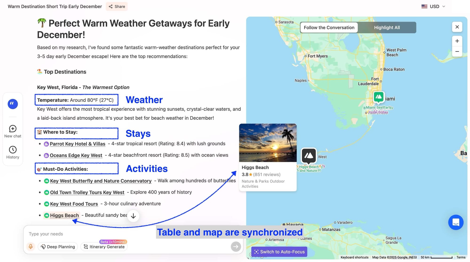 iMean AI Agent responded with flexible-date options to Key West, Miami, and San Diego—each presented with the most fitting stays, must-do seasonal activities, local temperature ranges, and highlighted attractions like waterfront walks, historic old towns, or thermal baths.