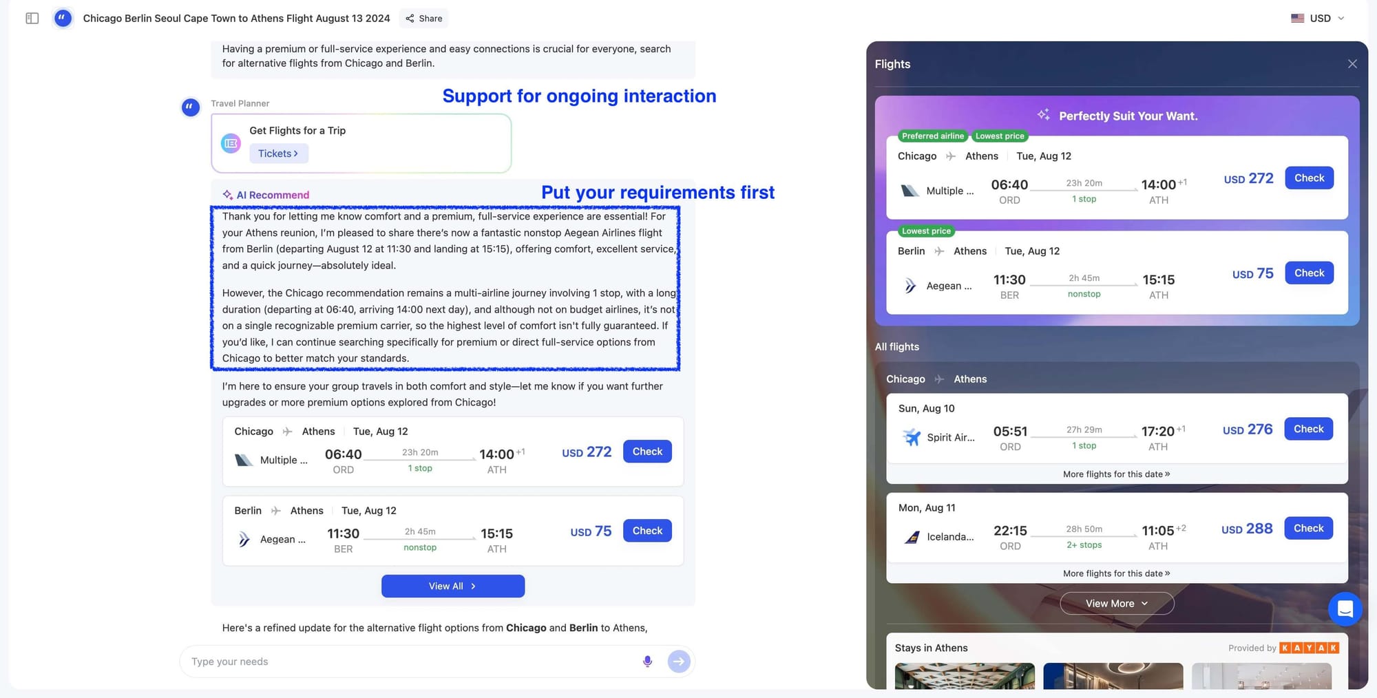 “Hi! Four of us are flying from different cities: Chicago, Berlin, Seoul, and Cape Town. And we want to meet in Athens. We’re flexible to depart between August 10–12, but we’d like to arrive in Athens around the same time on August 13. Please avoid budget airlines and overnight layovers. We prefer flights with good timing, short connections, and airports close to the city. Comfort matters more than the cheapest fare.”