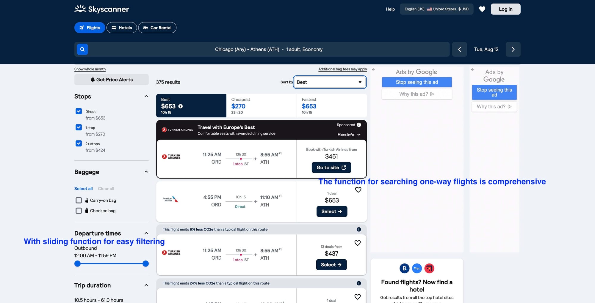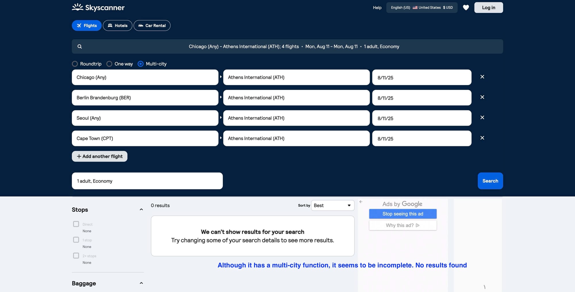 When I input all four departure cities for the same destination (Athens), it couldn’t generate results. The search would hang or return nothing, despite the tool claiming to support that kind of itinerary. That said, it’s still a great tool for individual one-way or round-trip flight planning. And its filtering system is intuitive and visual—ideal for finding shorter or more convenient flights on simple routes.