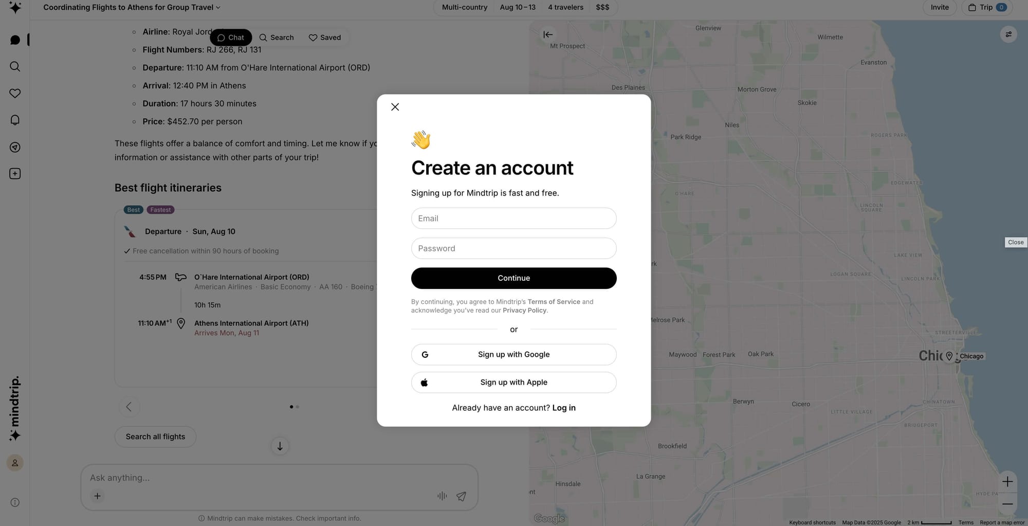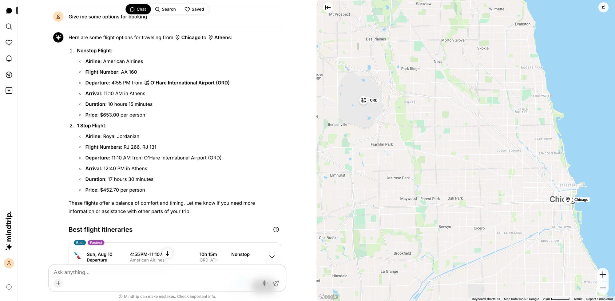After inputting my prompt, Mindtrip didn’t provide any flight suggestions until I asked again specifically. When it finally did, I received just one detailed flight option—from Chicago to Athens—complete with airline, timing, duration, and price. It was accurate and well-presented, but one flight isn’t enough when planning for a group of four across different continents.