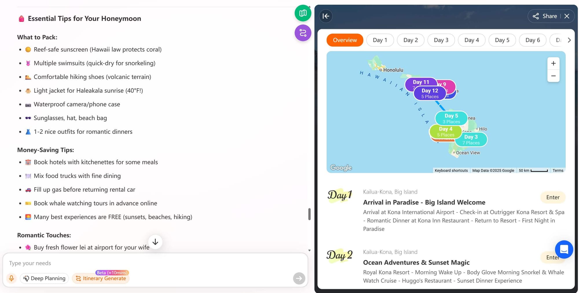 Hawaii offers diverse islands, stunning landscapes, and endless activities, but planning a trip can be overwhelming. Traditional websites only provide recommendations, while an AI trip planner like iMean creates a personalized, editable itinerary in minutes, including flights, hotels, and practical tips.