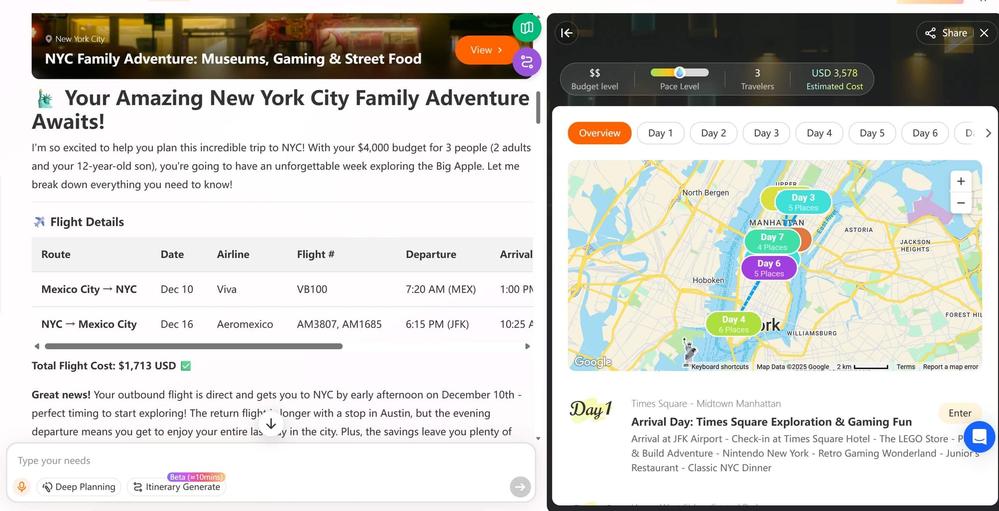 Planning a trip to New York can feel overwhelming, but breaking it down by neighborhoods, attractions, and transportation makes it manageable. Using an AI trip planner simplifies the process, creating a personalized itinerary while letting you book flights and hotels in one place. If you want a personalized, editable day-by-day itinerary for New York, try iMean’s free AI trip planner.